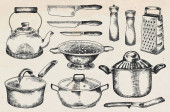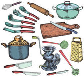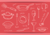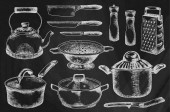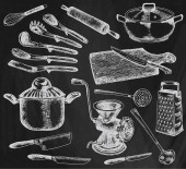 Zestaw przyborów kuchennych. Piękna ilustracja naczynia stołowe i kuchenne na tle tablica