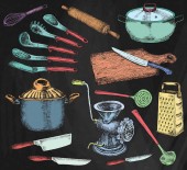 Zdjęcie "Zestaw przyborów kuchennych. Piękna ilustracja naczynia stołowe i kuchenne na tle tablica" może być wykorzystywane do celów osobistych i komercyjnych zgodnie z warunkami zakupionej licencji Royalty-free. Obraz jest dostępny do pobrania w jakości wysokiej rozdzielczości do 5760x3840.