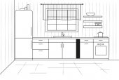 Szkic kuchnia z oknem. Ilustracja wektorowa w stylu szkicu.