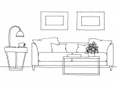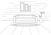 Nowoczesne wnętrza. Kanapa, Lampa podłogowa i stolik. Zegar wisi na ścianie. Przed kanapie jest dywan. Ilustracja wektorowa w stylu liniowe.