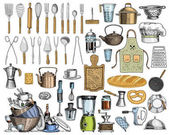 Fartuch lub pinaphora i kaptur, wałkiem i rondla lub corolla, deska. Szef kuchni i brudne naczynia do gotowania rzeczy dla menu ozdoba. grawerowane ręcznie rysowane w stary styl szkic i vintage.