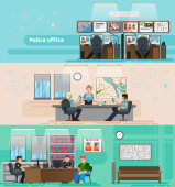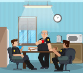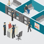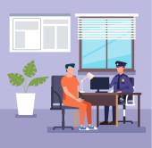 Ilustracja wektorowa w stylu płaski, pokój na przesłuchanie podejrzanego w posterunku policji. Scena pracy funkcjonariuszy Departamentu dochodzeń, z udziałem policjanta, podejrzany, prawnik.
