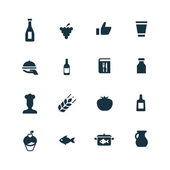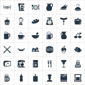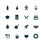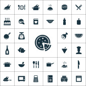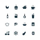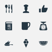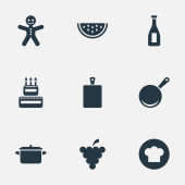 Wektor ilustracja zestaw prostych ikon gotowania. Elementy warstwowe, naczynia, organiczne owoce synonimy żywności, mięso i Muffin.