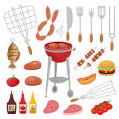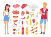 Młody człowiek i grill party elementów na białym tle. Produkty Bbq, stek, mięso ryb, wołowina, warzywa, zioła, fast food, wina i piwa. Elementy posiłek w ramce kiełbas