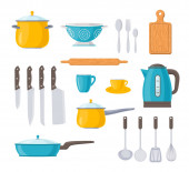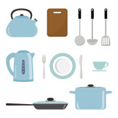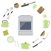 Białe kształty, naczynia i narzędzia na pomarańczowym tle