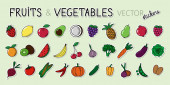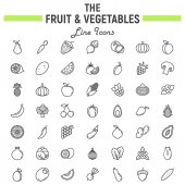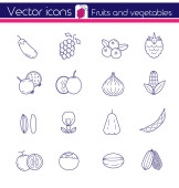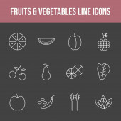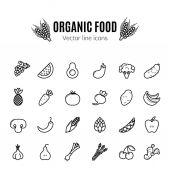 Zestaw ikon owoców i warzyw. Piktogramy naturalne bio Vegan. Karczoch, szparagi, pszenicy, banany, winogrona, porów, czosnek, imbir i inne znaki żywności ekologicznej.