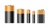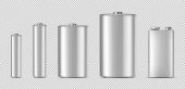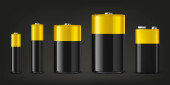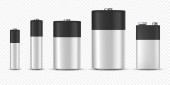 Realistyczne batteriy alkaliczne wektor zestaw ikon. Rozne rozmiar - Aaa, Aa, C, D, Pp3. projekt szablonu dla marki, makieta. Zbliżenie na białym tle. Wektor.