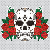 Cukru czaszki z ozdobny wzór i wieniec czerwonych róż.