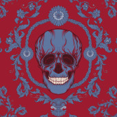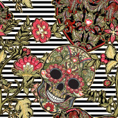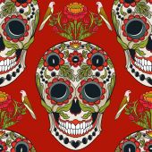 Zdjęcie "Cukru czaszki z ozdobny wzór i wieniec czerwonych róż." może być wykorzystywane do celów osobistych i komercyjnych zgodnie z warunkami zakupionej licencji Royalty-free. Obraz jest dostępny do pobrania w jakości wysokiej rozdzielczości do 5760x3840.