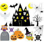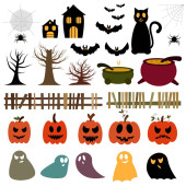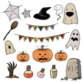 Happy halloween zestaw znaków w stylu cartoon naklejki z dyni, Pająk, ghost, bat i cukierki na tle papieru. Ilustracja wektorowa.