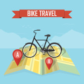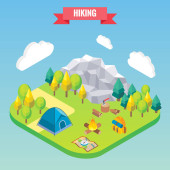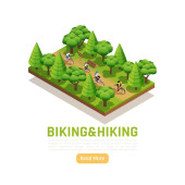 Rowerowe koncepcja izometryczny touring. Podróże i wakacje wektor ilustracja w stylu płaski 3d. Obóz na świeżym powietrzu. Podróży na rowerze