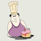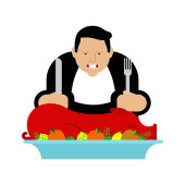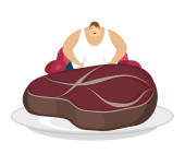 Gruby facet i stek. Gruby mężczyzna żarłok i kawałek mięsa. grubasek ve