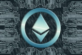 Monety złote ethereum na tle kod binarny i ci elektronicznej