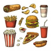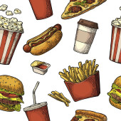 Ustaw fast food. Kawa, hamburger, pizza, hot dog, smażone ziemniaki, popcorn