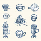 Zestaw do kawy. Latte szkła, ręka trzymać kubek. Oddział z fasoli