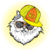 Ładny kotek w czapkę z kolcami i okulary. Ilustracja wektorowa pocztówka lub plakat. Śmieszne kot. Zwierzę w ubrania.
