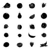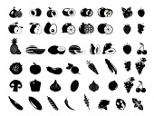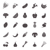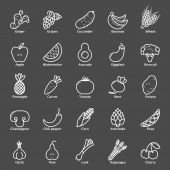 Zestaw ikon owoców i warzyw. Piktogramy naturalne bio Vegan. Karczoch, szparagi, pszenicy, banany, winogrona, porów, czosnek, imbir i inne znaki żywności ekologicznej.