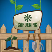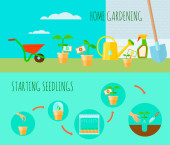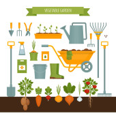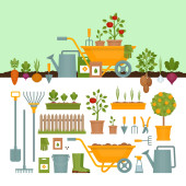 Koncepcja produkcji ogrodniczej. Narzędzia ogrodowe. Banner z letnim ogrodem krajobrazowym. Płaski, ilustracji wektorowych.