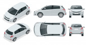 Wektor kompaktowy mały samochód. Mały kompaktowy Hybrydowy pojazd. Eco Przyjacielski hi-tech auto. Zmiana koloru łatwe. Szablon wektor na białym tle na biały widok przodu, tylne, boczne, góry i izometryczny