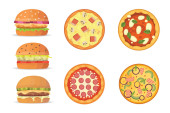 Ilustracja wektorowa różnych fast food. Kreskówki, pizza i burger na białym tle ilustracja