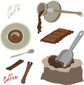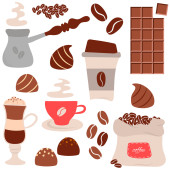 Zestaw do kawy i słodkie desery na białym tle ilustracji wektorowych. Różne typy, w tym espresso, macchiato, czekolada.