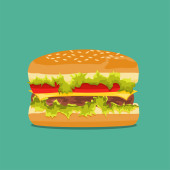 Hamburger z mięsem, serem i sałatka płaski. Ilustracja kreskówka.