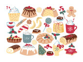 Boże Narodzenie żywności wektor desery na wakacje dekoracji xmas family diner słodkie święto posiłkiem ilustracja. Tradycyjnych uroczysty zima ciasto domowe party x-mas
