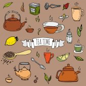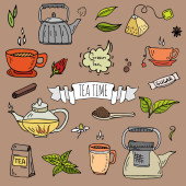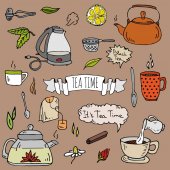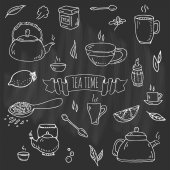 Ustaw ręcznie rysowane doodle herbata czas ikona. Ilustracja wektorowa. Na białym tle napój symboli kolekcji. Kreskówka różnych napojów elementu: kubek, Puchar, czajniczek, liść, torba, spice, płyta, mięty, ziołowe, cukier, cytryna.