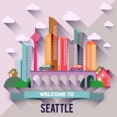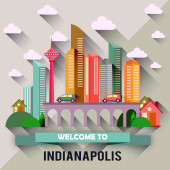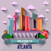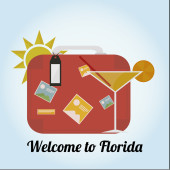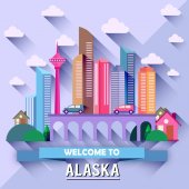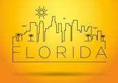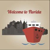 Ilustracja wektorowa kolorowe miasto nowoczesne wieżowce, samochody, most, rośliny, chmury i tekst Witamy na Florydzie