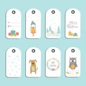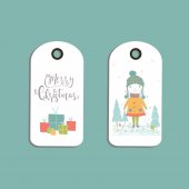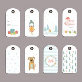 Nalepki, etykietki, odznaki z tło Boże Narodzenie, zima dom, białe płatki śniegu. Nowy rok wakacje wektor z przytulny dom, domek, krajobraz z drzew, miejsca na tekst. Szablon dla dekoracji, kartki, zaproszenia.