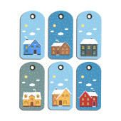 Zdjęcie "Nalepki, etykietki, odznaki z tło Boże Narodzenie, zima dom, białe płatki śniegu. Nowy rok wakacje wektor z przytulny dom, domek, krajobraz z drzew, miejsca na tekst. Szablon dla dekoracji, kartki, zaproszenia." może być wykorzystywane do celów osobistych i komercyjnych zgodnie z warunkami zakupionej licencji Royalty-free. Obraz jest dostępny do pobrania w jakości wysokiej rozdzielczości do 5760x3840.