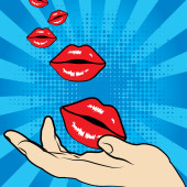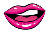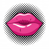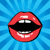 Pop art podekscytowany kobieta usta, czarny i niebieski tło kropki, wektor ilustracja moda