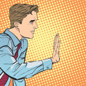 Człowiek siedzący zatrzymując się ktoś. Człowiek, zatrzymując się ktoś. Człowiek, odrzucając coś. Zakazywanie człowieka. Przystojny, młody biznesmen, dając sygnał stop.