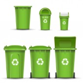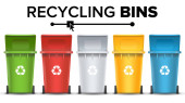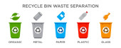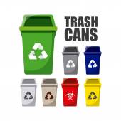 Recyklingu pojemników na białym tle wektor. Zestaw czerwony, zielony, niebieski, żółty, biały wiadra. Dla papieru, szkła, metalu, tworzyw sztucznych, recykling, odpadów sortowanie. Na białym tle