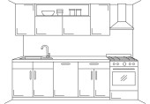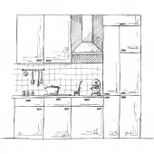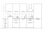 Szkic kuchnia meble na białym tle. Ilustracja wektorowa kuchnia w stylu szkicu.