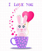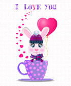 Królik trzymając balon czerwony serce siedzący w zielony kubek