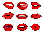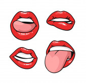 Kobiece usta zestaw. Usta pocałunkiem, uśmiech, języka, zębów. Wektor