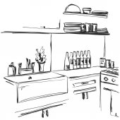 Zdjęcie "Kuchnia wnętrz rysunku, ilustracji wektorowych. Meble szkicu" może być wykorzystywane do celów osobistych i komercyjnych zgodnie z warunkami zakupionej licencji Royalty-free. Obraz jest dostępny do pobrania w jakości wysokiej rozdzielczości do 5760x3840.