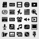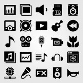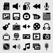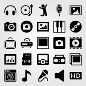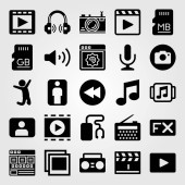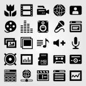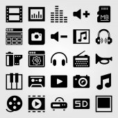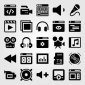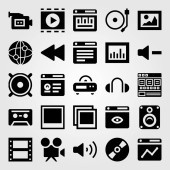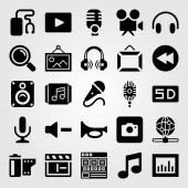 Multimedialne wektor zestaw ikon. mikrofon, analytics, odtwarzacz wideo oraz radio