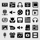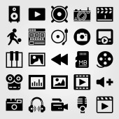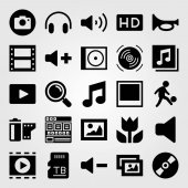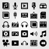 Multimedialne wektor zestaw ikon. mikrofon, dysk CD, do tyłu i analiz