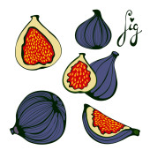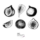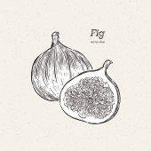 Ilustracja owoców z figami w stylu grawerowania. Szczegółowe posiłki wegetariańskie. Ręcznie rysowane elementy menu, karty okolicznościowe, papier pakowy, kosmetyki, opakowania, etykiety, znaczniki, plakaty itp