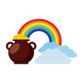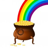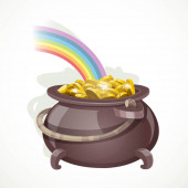 Garnek krasnoludek złota na końcu tęczy. Tradycyjny St Patricks day symbol, ilustracja na białym tle klipu. Płaskie kreskówka wektor styl.