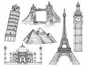 zabytki architektury, krzywej wieży w Pizie, Wieża Eiffla, big Bena, Koloseum, piramidy, Statua wolności