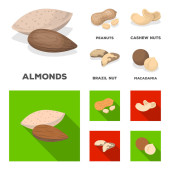Orzeszki ziemne, orzechy nerkowca, orzechy brazylijskie, macadamia. Różne rodzaje orzechów zestaw kolekcji ikon w kreskówce, www ilustracji symbol wektor płaski.