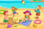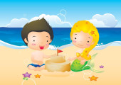 kreskówki, dziewczyna i chłopak, bawiące się w piasku