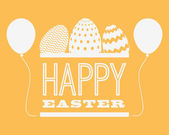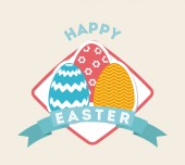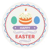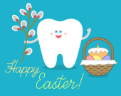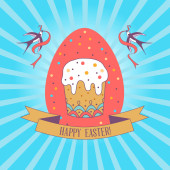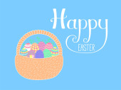 Wesołych Świąt! Wakacje z życzeniami. Wiklinowy kosz z chlebem lub tradycyjne ciasto, jajka, serwetka, gałęzi wierzby. Ilustracja na niebieskim tle.