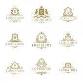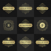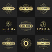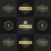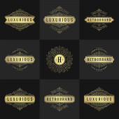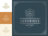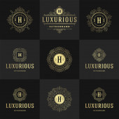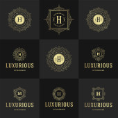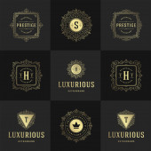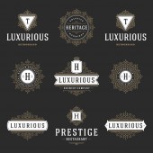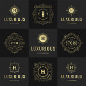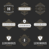 Szablony loga luksusowy zestaw, kwitnie kaligraficzny ornament eleganckie linie. Znak firmy, odznaki i monogramy elegancki crest, marka boutique, sklep ślubny, hotel znak, projektant mody.