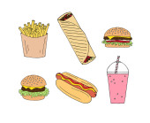 Fast food kolekcja kolorowe ikony. Wektor ilustracja płaski kreskówka na białym tle.