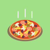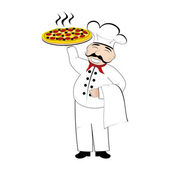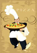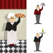 Kelner posiada pizza, włoska pizza w restauracji. Kelner pizzeria. Kreskówka, retro