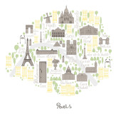 Kreskówkowa mapa Paryża z legendarnymi ikonami. Projekt druku
